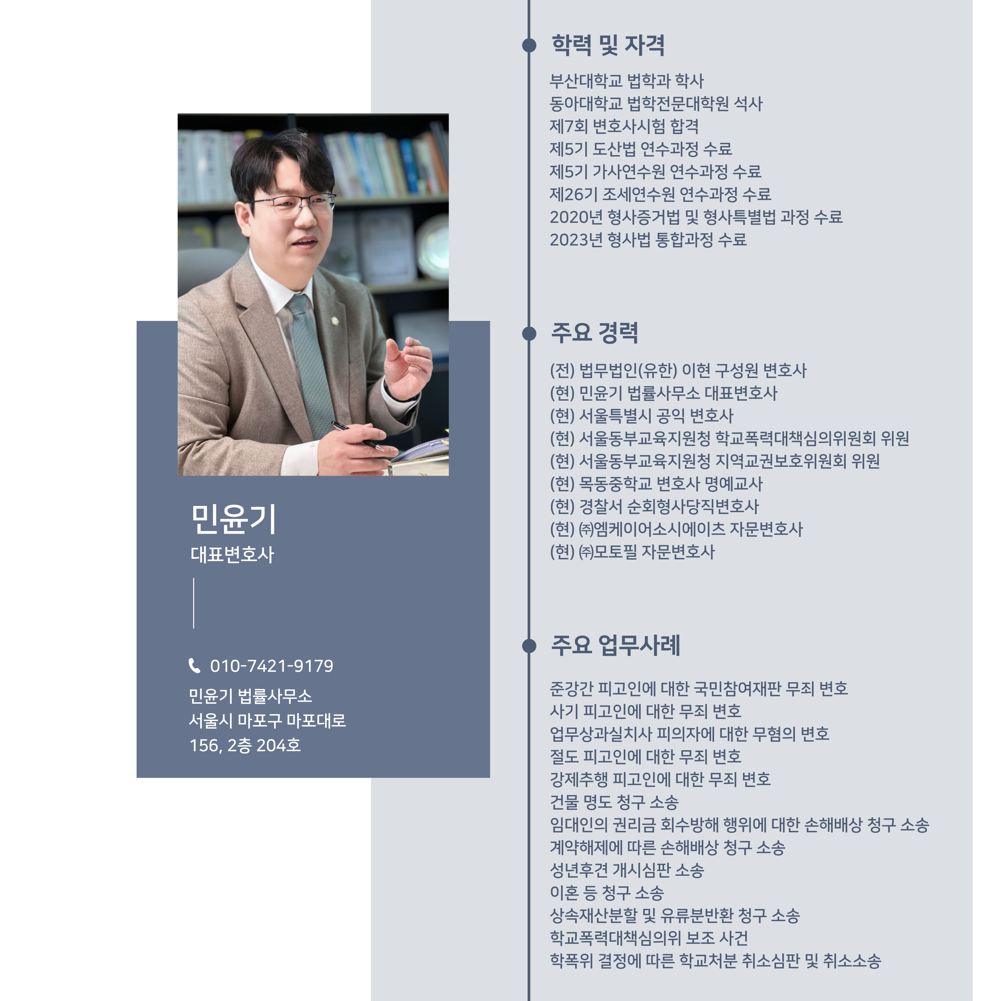 저는 민윤기법률사무소의 대표변호사로서, 대한변호사협회에 정식 등록된 형사전문변호사로 여러분을 만나 뵙고 있습니다.